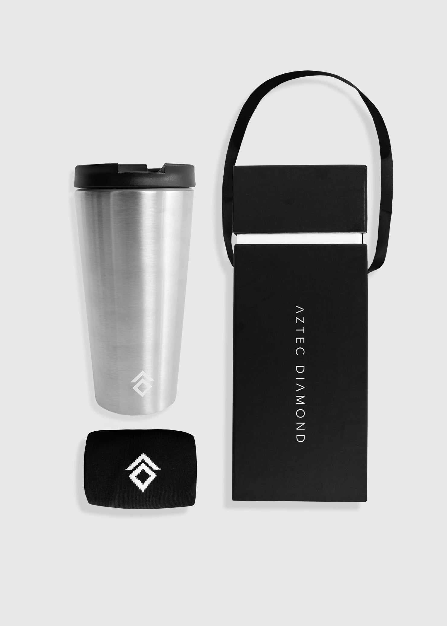 A luxurious black and chrome silver gift box, containing an AD thermal travel mug which keeps drinks temperature stable fir up to 12 hours - both hot and cold, and a pair of our black underboot knee high socks. The perfect winter gift set!